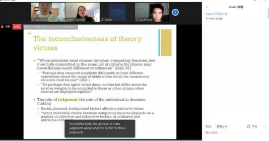 The content of course is rich. It can be divided into four parts: "demarcation", "scientific revolution", scientific realism" and "scientific value". Students have opportunity to read abundant and detailed reading materials. The questionnaire after the course helps students in self-examination. This project requires students to have a high level of self-study ability. However, I faced many challenges in the early stage of the project. For example, it is somewhat difficult to communicate with my professor. Sometimes I cannot follow with her in class with the anxiety and fear of foreign language learning. In order to better participate in activities, I reviewed what I have learned according to Introduction to the Philosophy of Science and Technology. Based on the course outline, I studied and sorted out the issued reading materials, especially the PowerPoint prepared by Ms.Ivanova and Mr.Perkins, and carefully thought about the questions after class to make sure that I am clear about the main content of the class. Day by day, I gradually kept pace with professors.