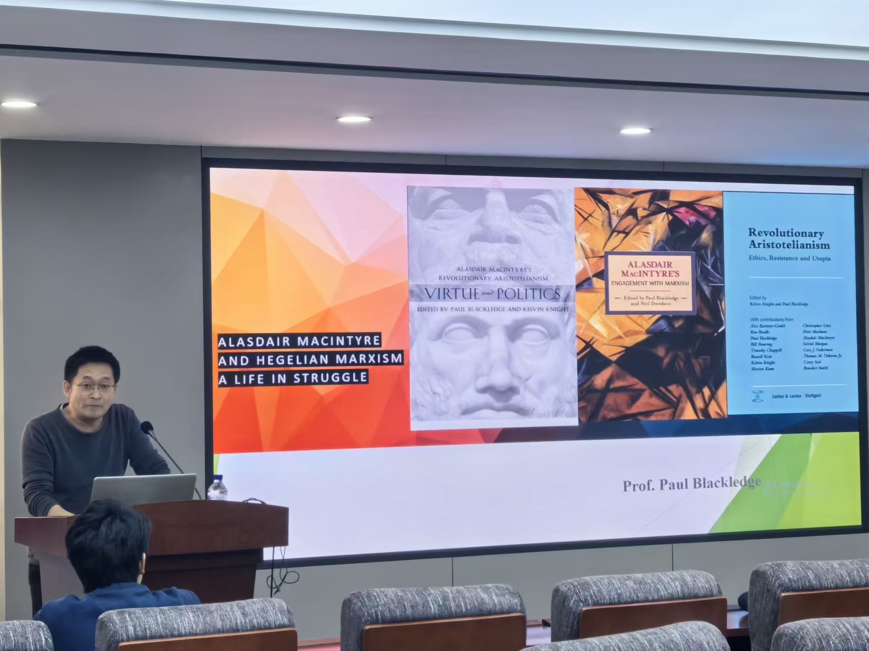 在“麦金太尔:资本主义下德性生活的可能——从亚里士多德和马克思出发”的讲座中,布莱克里奇教授围绕麦金太尔“一生的思想斗争”展开,论述了麦金太尔对黑格尔主义的马克思主义的继承与反思。