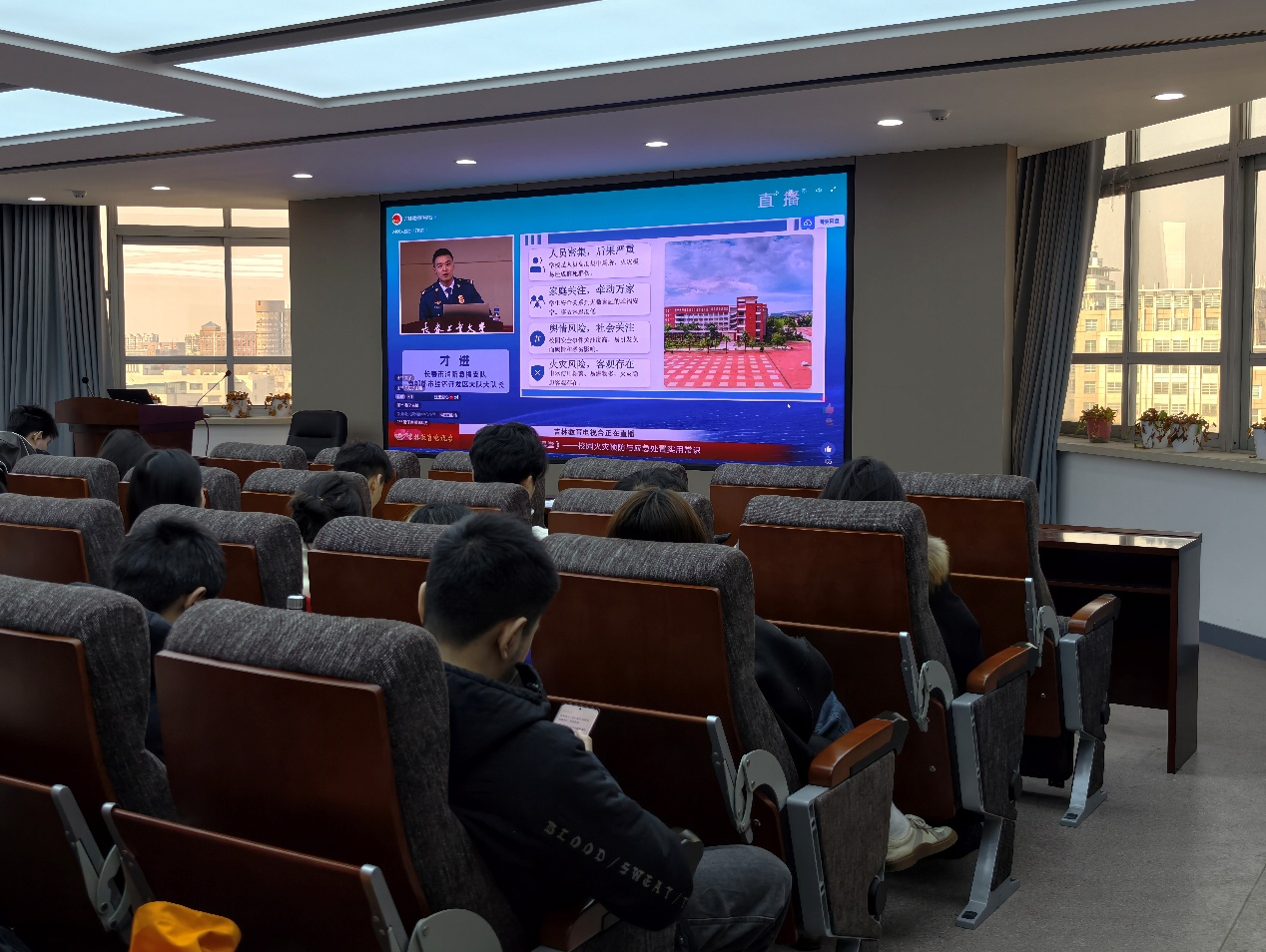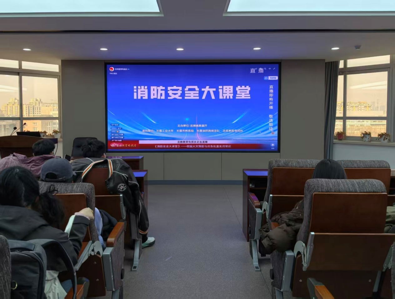 研究生办公室组织在校研究生于东荣大厦904会议室观看由吉林省教育厅主办的校园消防安全大课堂直播,云端学习消防安全知识与应急技能。
